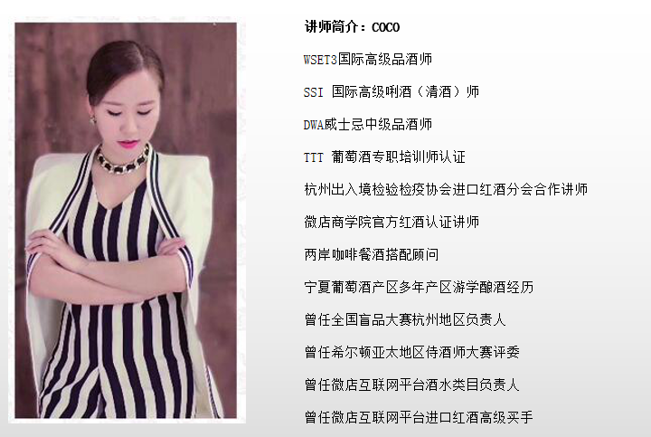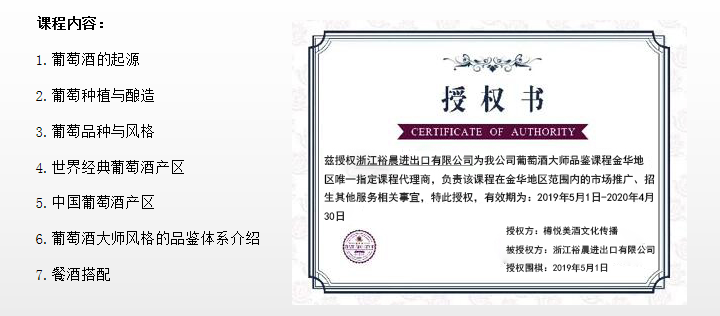 該課程針對(duì)葡萄酒從業(yè)者與愛(ài)好者,通過(guò)葡萄酒的歷史,種植與釀造等知識(shí),系統(tǒng)的學(xué)習(xí)葡萄酒,尤其是葡萄酒大師風(fēng)格的品鑒體系。本課程在引進(jìn)過(guò)程中,加入了中國(guó)葡萄酒產(chǎn)區(qū)的內(nèi)容。Robert Geddes MW在中國(guó)產(chǎn)區(qū)進(jìn)行了多年的實(shí)地考察,從一位葡萄酒大師的角度,對(duì)中國(guó)葡萄酒產(chǎn)區(qū)進(jìn)行描述。Robert Geddes MW在葡萄酒行業(yè)工作了數(shù)十年,經(jīng)歷了數(shù)個(gè)新興葡萄酒國(guó)家從無(wú)到有的歷程,他希望接下來(lái)可以見(jiàn)證中國(guó)葡萄酒行業(yè)在世界上的崛起,因此在金華成立了培訓(xùn)考點(diǎn),致力于葡萄酒文化的對(duì)內(nèi)對(duì)外的引進(jìn)與輸出-引進(jìn)國(guó)外的原汁原味的葡萄酒文化到中國(guó),同時(shí)將中國(guó)的葡萄酒產(chǎn)區(qū)推向國(guó)際。三級(jí)品酒大師COC0接下來(lái)大部分的時(shí)間將常駐金華,教大家葡萄酒大師初級(jí)品酒師的培訓(xùn)與咨格證書(shū)的審批和發(fā)放。